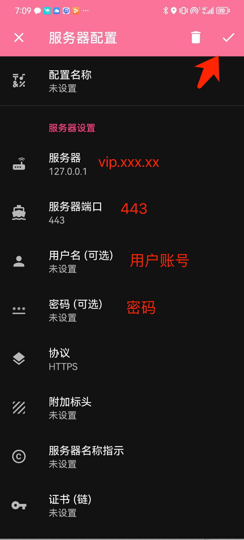 3. 输入服务器地址、账号、密码、端口号, 点击右上角 ✅。完成配置。
